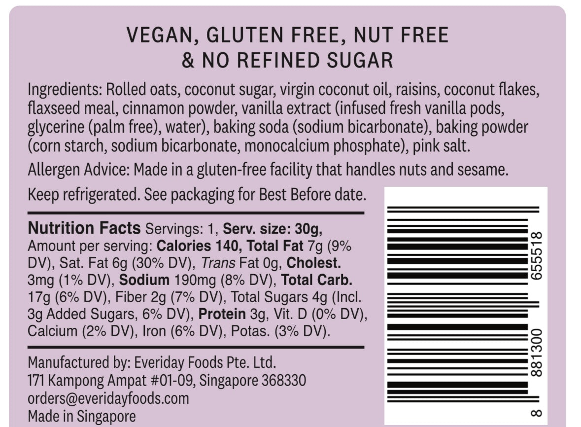 Ingredients: Rolled Oats, Coconut Sugar, Virgin Coconut Oil, Raisins, Coconut Flakes, Flaxseed Meal, Cinnamon Powder, Vanilla Extract, Baking Soda, Baking Powder, Pink Salt.