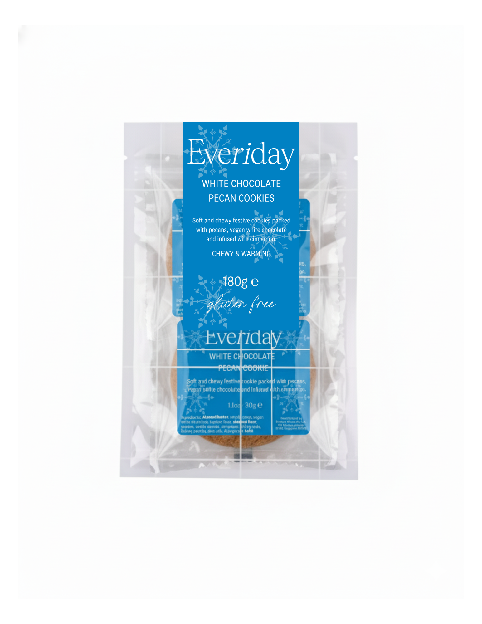 Soft and chewy cookies with crunchy pecans, creamy vegan white chocolate, and a sprinkle of sea salt flakes for the perfect festive treat.