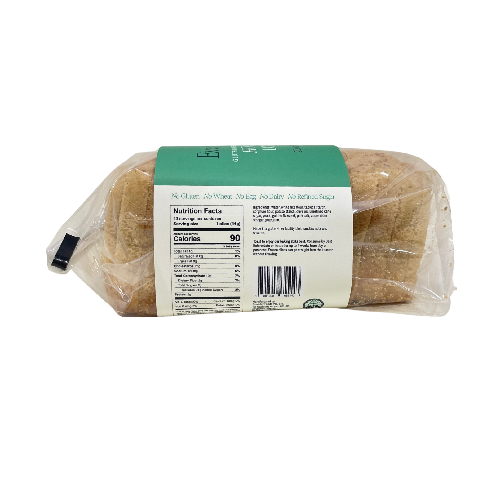 Ingredients: Water, white rice flour, tapioca starch, sorghum flour, potato starch, olive oil, unrefined cane sugar, yeast, golden flaxseed, pink salt, apple cider vinegar, guar gum.