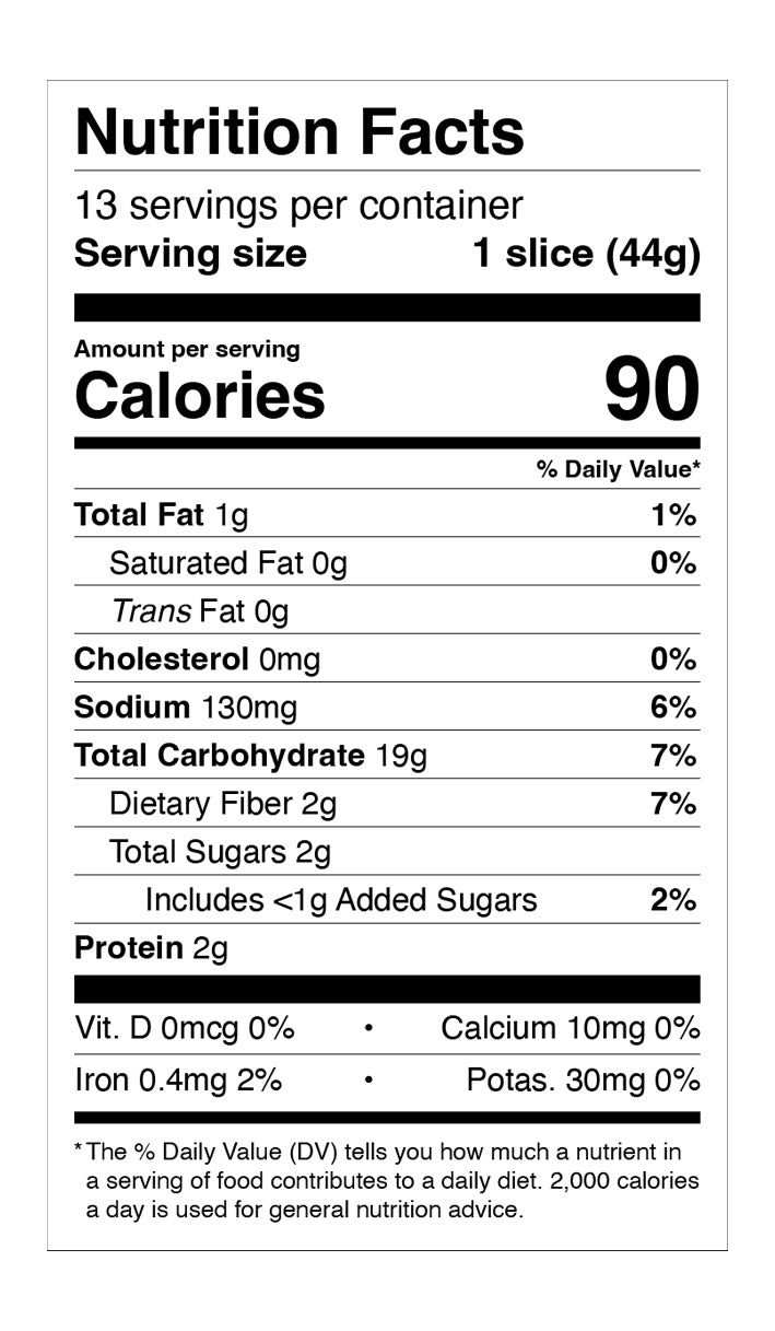 Ingredients: Water, buckwheat flour, white rice flour, tapioca starch, sorghum flour, gluten free oats, mixed seeds (golden flaxseed, chia seeds, sunflower seeds, pumpkin seeds), olive oil, potato starch, unrefined cane sugar, pea protein, yeast, apple cider vinegar, guar gum, pink salt.