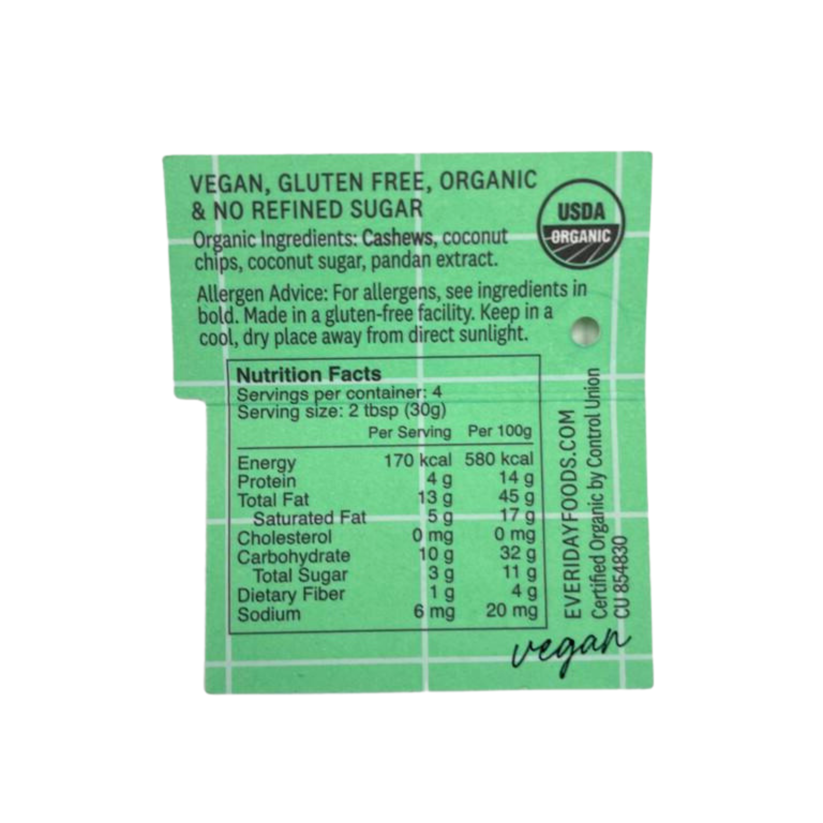 Organic Ingredients: Baked cashews, raw coconut chips, coconut sugar, pandan extract.