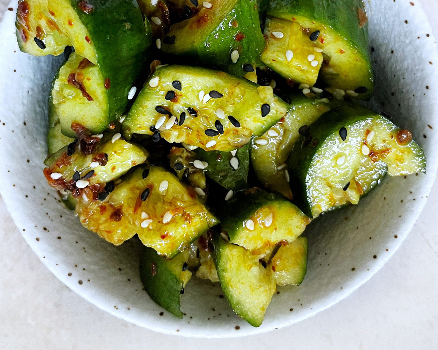 Lay your cucumber on a cutting board, and trim the edges. Then with the flat of your knife, smash the cucumber a few times so that you crush it. Once crushed, chop the cucumber into 1-inch pieces. Add to a bowl, and repeat with your 2nd cucumber. (Crushing the cucumber give more surface space and texture to absorb all the flavor from the seasoning.)